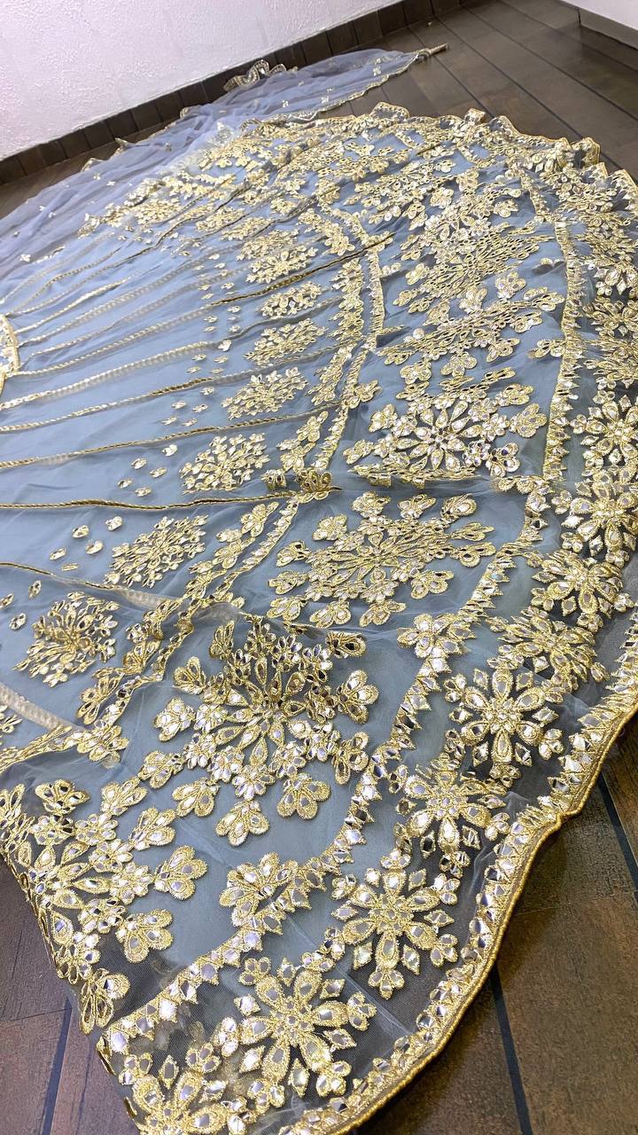 Elegant and radiant, this sky blue bridal lehenga choli is crafted in premium net fabric with delicate foil paper and zari work. The lehenga features attached can-can for structured volume and a graceful 4 meter flair that creates a statement silhouette.