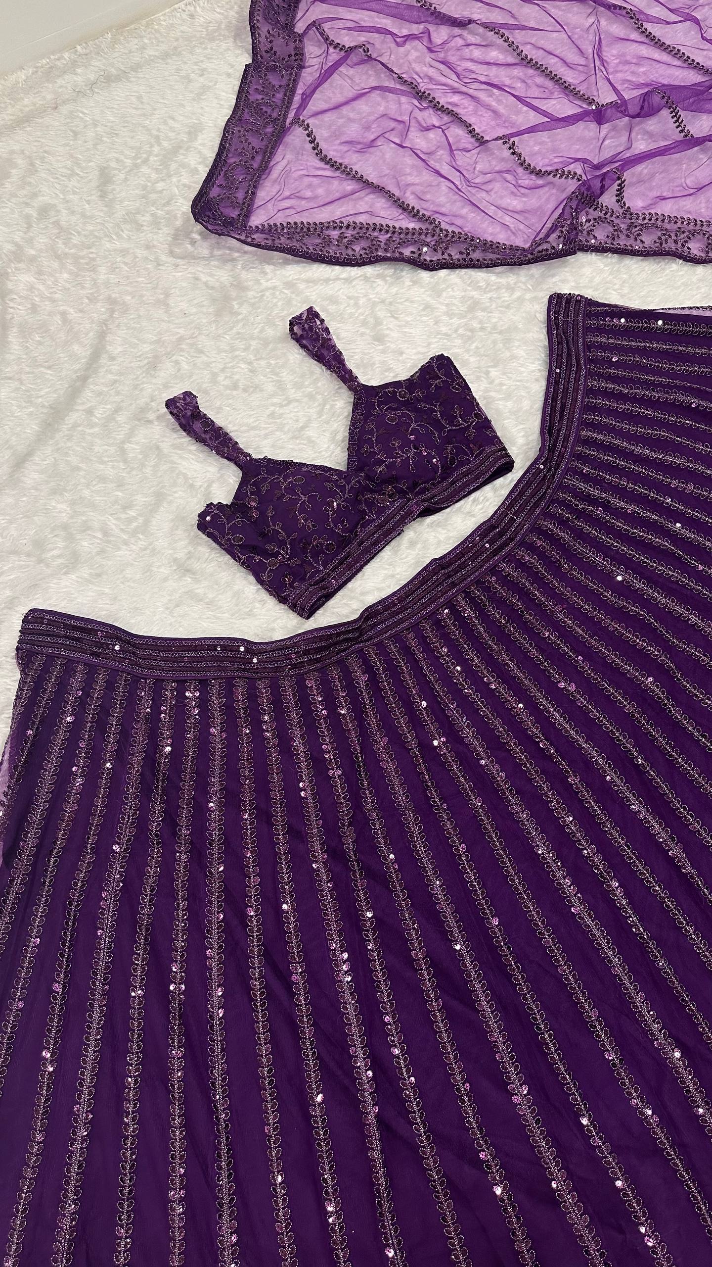 Gracefully designed in rich purple net fabric, this bridal lehenga choli features intricate sequins and dori embroidery for a refined festive glow. The lehenga is supported with attached can-can for structured volume and elegant movement.