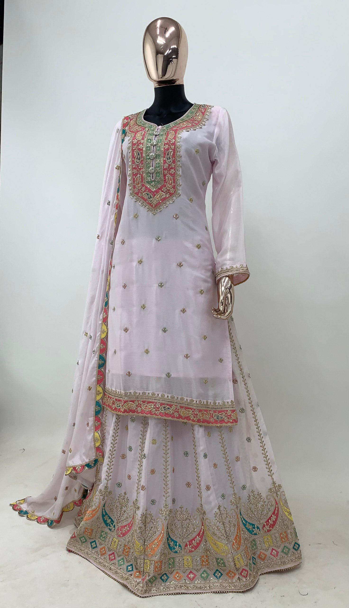 Look your elegant best in this stunning embroidered Chinon suit set! This beautiful set features a fully stitched kurta with intricate embroidery work, paired with comfortable Chinon bottoms and a matching Georgette embroidered dupatta. The kurta length is up to 42 inches, available in sizes L (40), XL (42), and XXL (44) for a perfect fit. The bottoms are also fully stitched and come in a universal size of 42 inches.